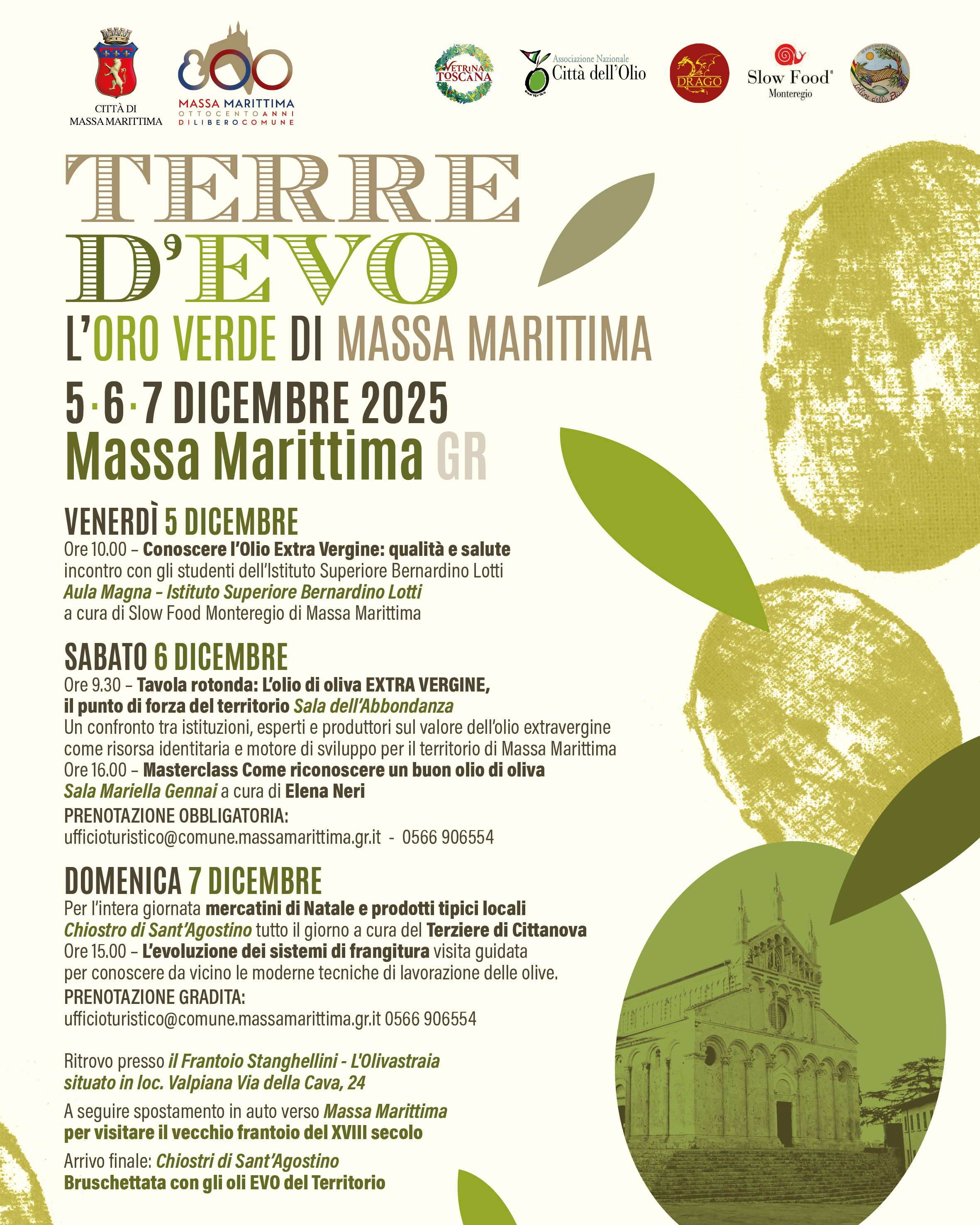 Al via la prima edizione di “Terre d'Evo". L'Oro Verde di Massa Marittima”, una tre giorni dedicata alla cultura dell’olio extravergine d’oliva, alle produzioni locali e alla valorizzazione del territorio, in programma venerdì 5, sabato 6 e domenica 7 dicembre a Massa Marittima.
