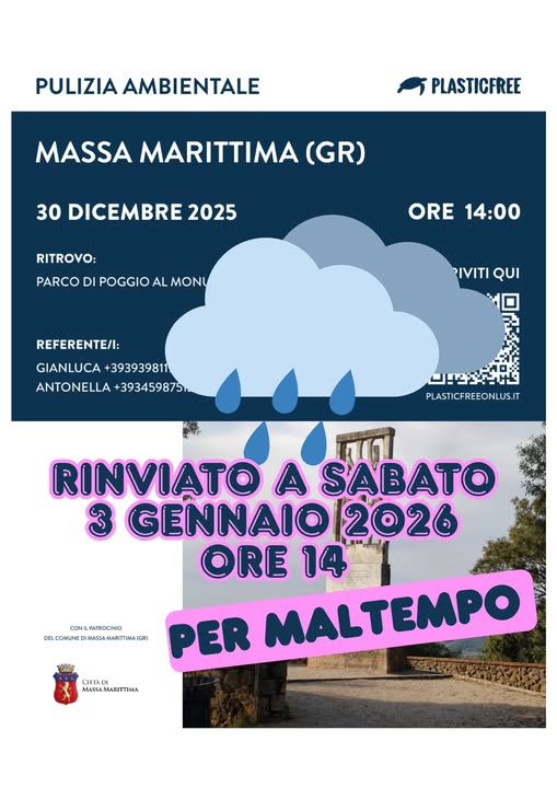 Rinviata per maltempo a sabato 3 gennaio la pulizia ambientale che era in programma oggi 30 dicembre.
