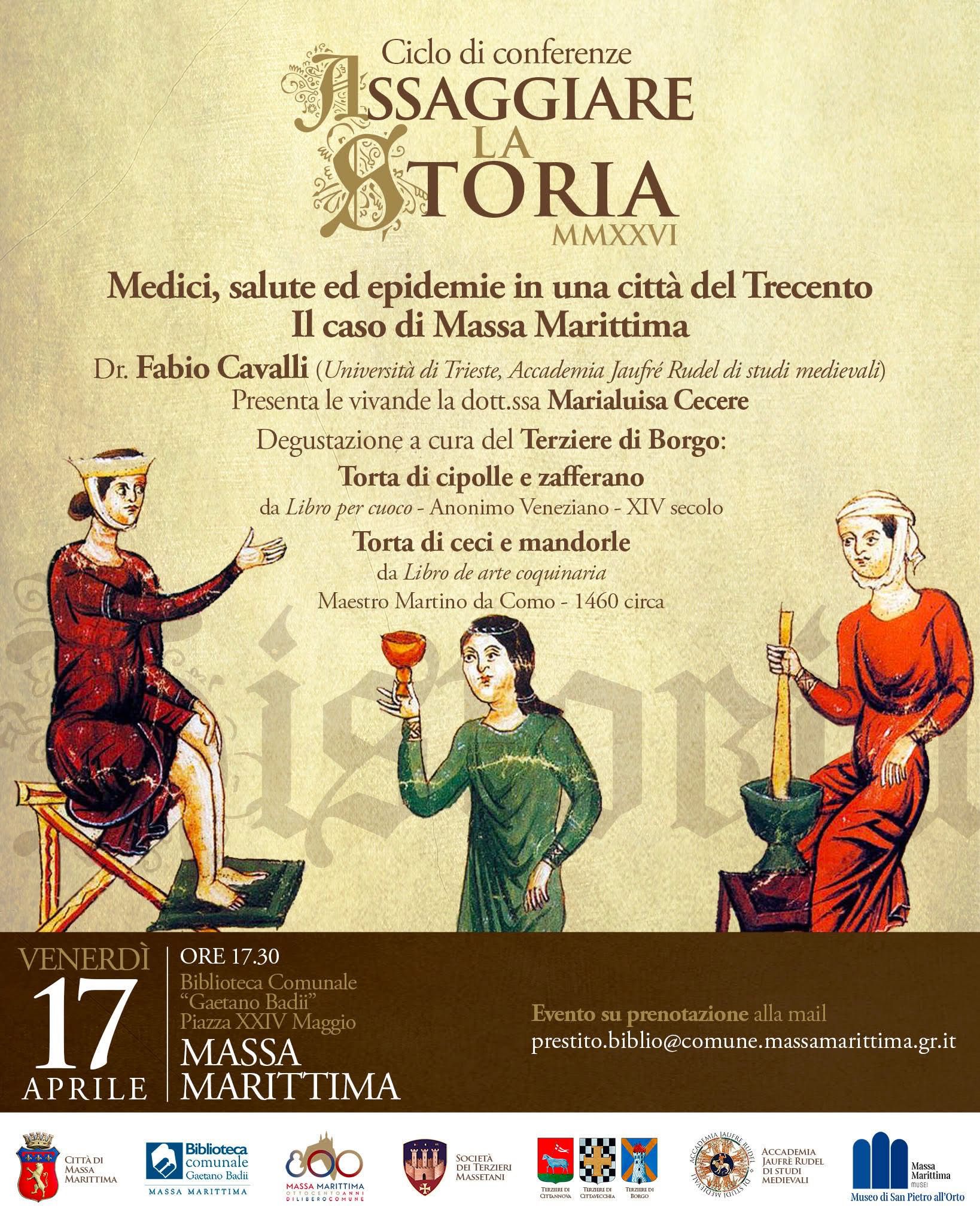 L’incontro sarà dedicato al tema “Medici, salute ed epidemie in una città del Trecento. Il caso di Massa Marittima”. Relatore il professor Fabio Cavalli, docente di storia della medicina all’Università degli studi di Trieste, e membro dell’Accademia Jaufré Rudel di studi medievali. Seguirà la degustazione storica a cura del Terziere di Borgo: torta di cipolle e zafferano, dal Libro per cuoco – anonimo veneziano, XIV secolo, torta di ceci e mandorle, dal Libro de arte coquinaria di Maestro Martino da Como (circa 1460). Presenta le vivande la dott.ssa Marialuisa Cecere, responsabile della sezione di studio di storia dell’alimentazione dell’Accademia Jaufré Rudel di studi medievali.