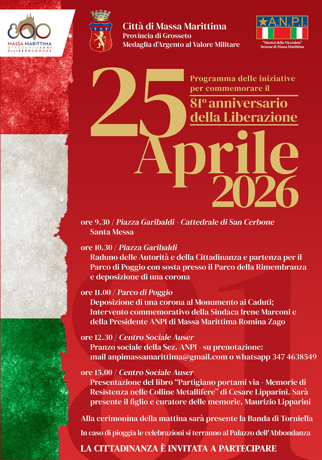 Il Comune di Massa Marittima per celebrare l’81 Anniversario della Liberazione ha promosso in collaborazione con ANPI “Martiri della Niccioleta”, sezione di Massa Marittima un articolato programma.