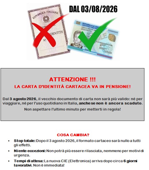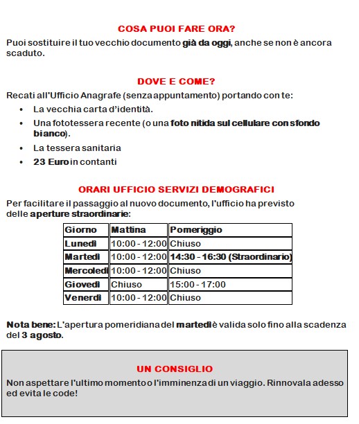 Dal 3 agosto 2026, la carta di identità cartacea non sarà più valida. Per facilitare chi deve sostituire il vecchio documento con quello elettronico (CIE), l'Ufficio Anagrafe ha previsto un'apertura straordinaria il martedì dalle 14,30 alle 16,30 a partire dal 24 febbraio.