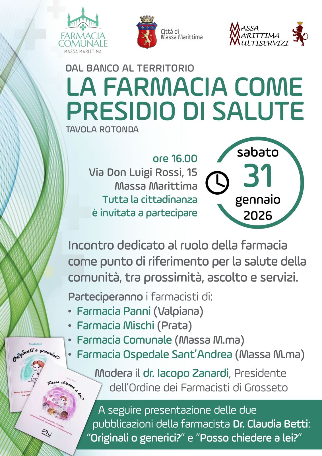 Sabato 31 Gennaio alle ore 16:00 alla Farmacia Comunale di Massa Marittima, una tavola rotonda. La cittadinanza è invitata a partecipare.