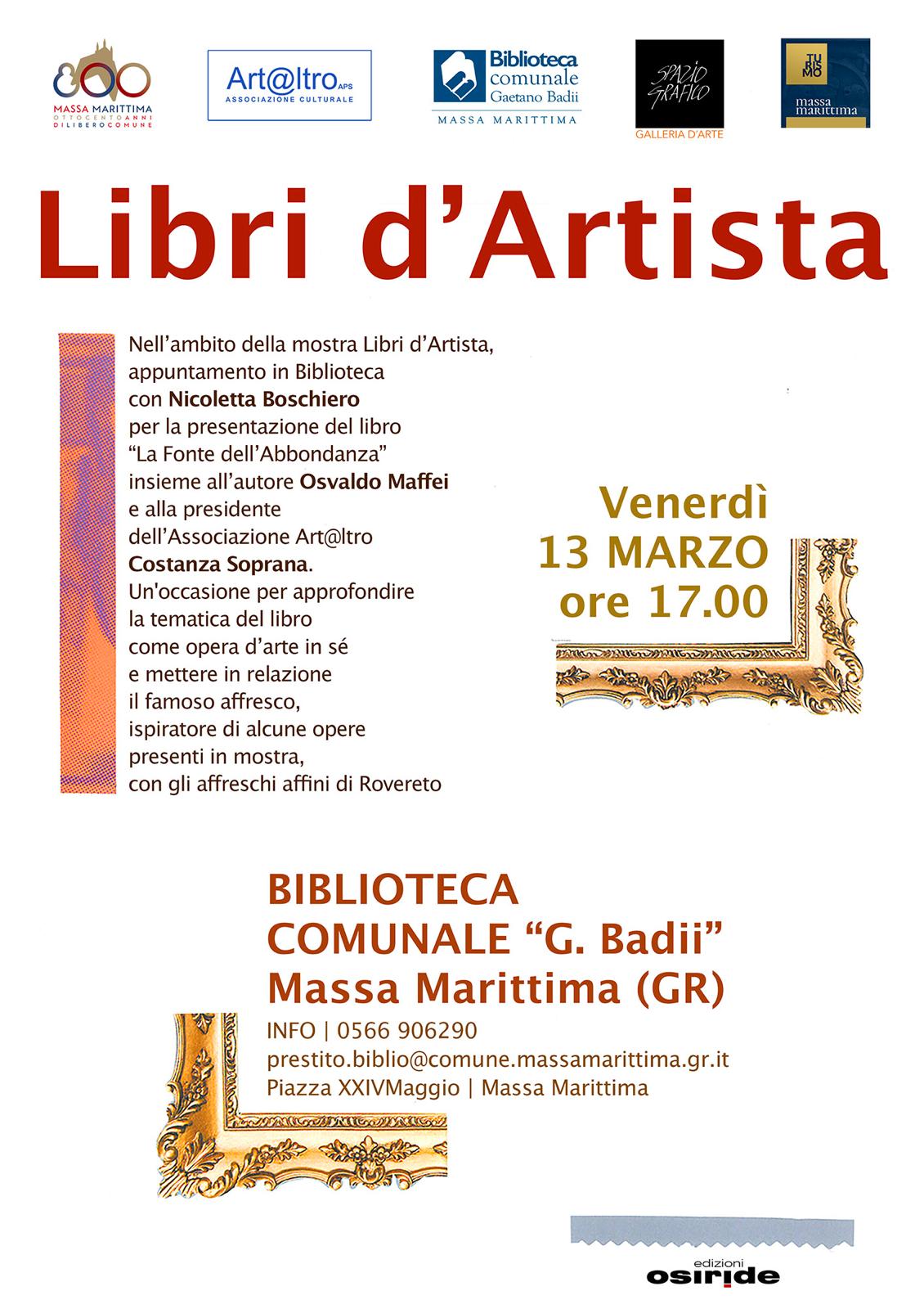 Nell’ambito della mostra “Libri d’Artista”, attualmente in corso presso la Biblioteca Comunale Gaetano Badii di Massa Marittima, venerdì 13 marzo, alle ore 17, in biblioteca, si terrà la presentazione del libro di Osvaldo Maffei, “La fonte dell’Abbondanza”, pubblicato dalla casa editrice Osiride.