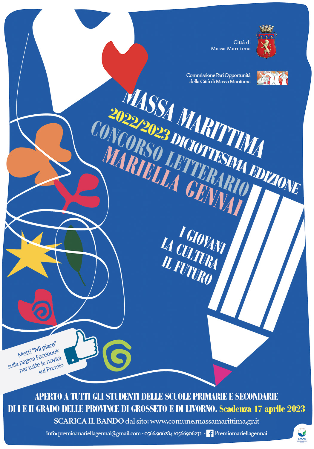 Prorogata alle ore 12 del 17 aprile 2023, la scadenza del Premio letterario Mariella Gennai rivolto agli studenti delle scuole Primarie e Secondarie di I e II grado delle province di Grosseto e di Livorno. Nell’ambito del concorso è previsto anche un Premio Speciale per la Casa Circondariale di Massa Marittima.