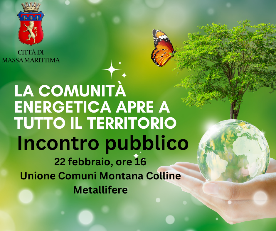 Il Comune di Massa Marittima organizza un incontro pubblico aperto alla cittadinanza sulle opportunità dell’adesione alla Comunità energetica. L’iniziativa si terrà giovedì 22 febbraio, alle ore 16, nella sede dell’Unione dei Comuni Montana Colline Metallifere.