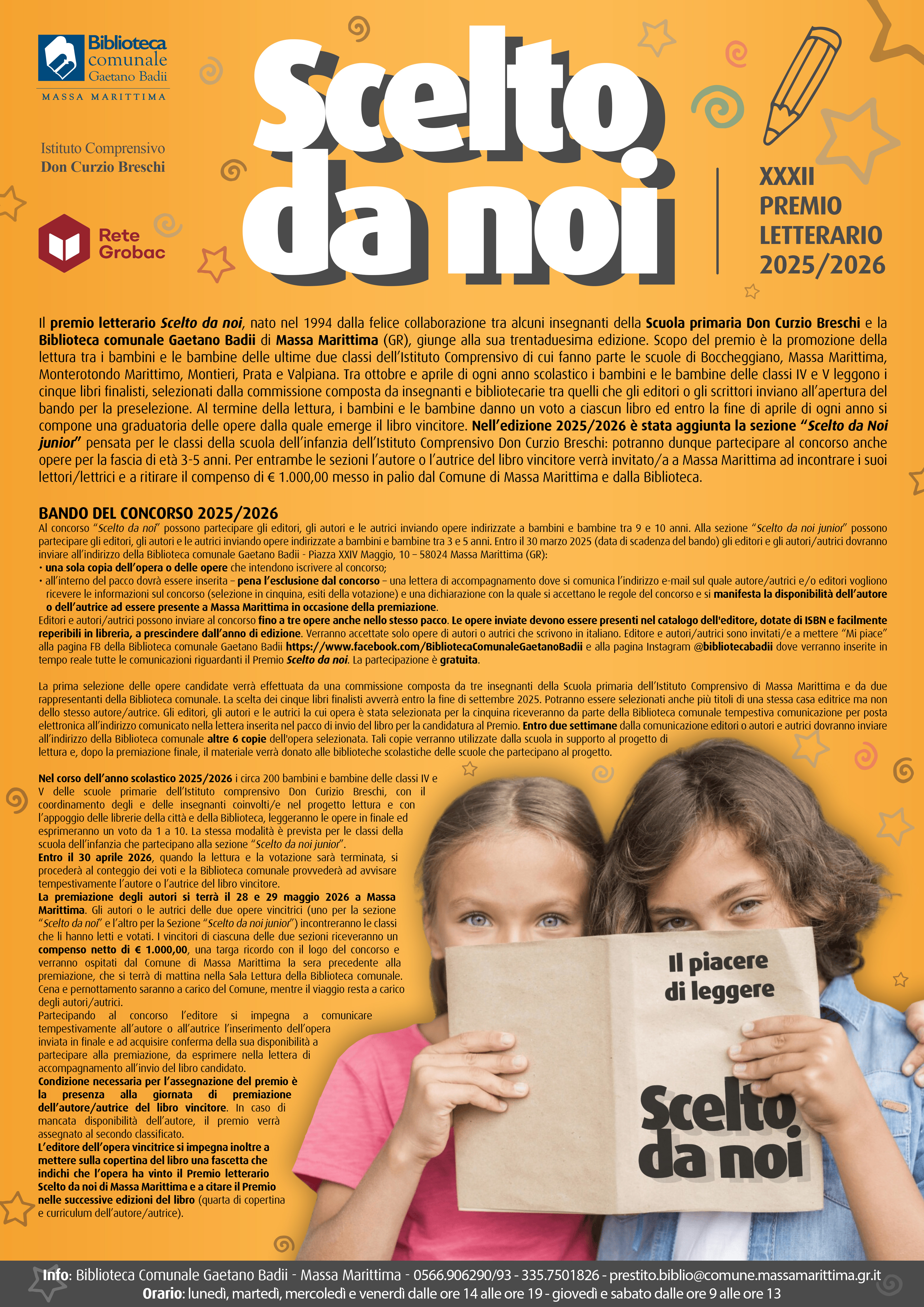 Al via la 32° edizione del premio letterario “Scelto da noi”, che nasce dalla collaborazione tra la Scuola primaria Don Curzio Breschi e la biblioteca comunale Gaetano Badii di Massa Marittima.