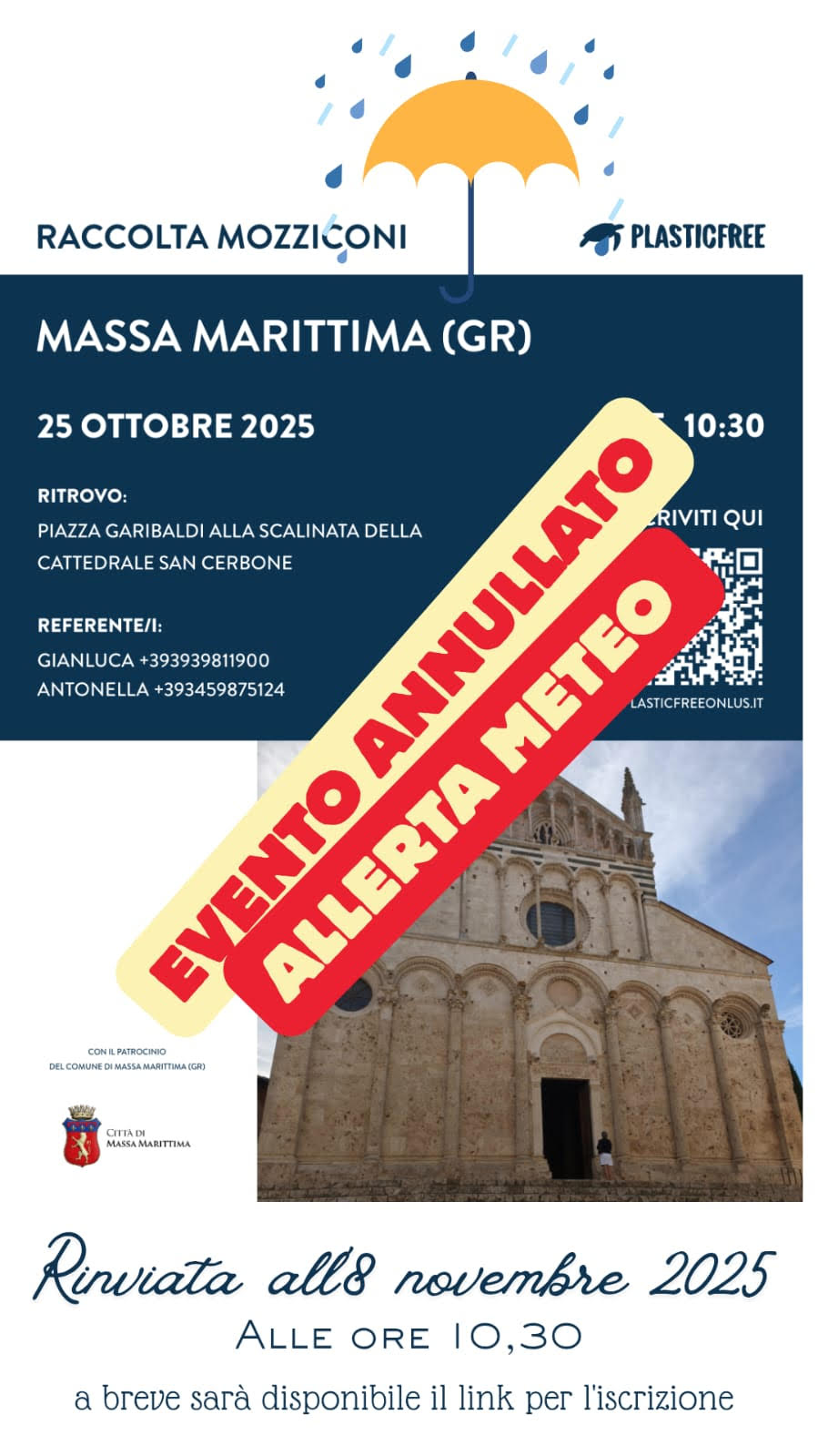 A causa dell'allerta meteo è l'evento di raccolta dei mozziconi a Massa Marittima è stato rinviato alla data del 8 Novembre 2025.