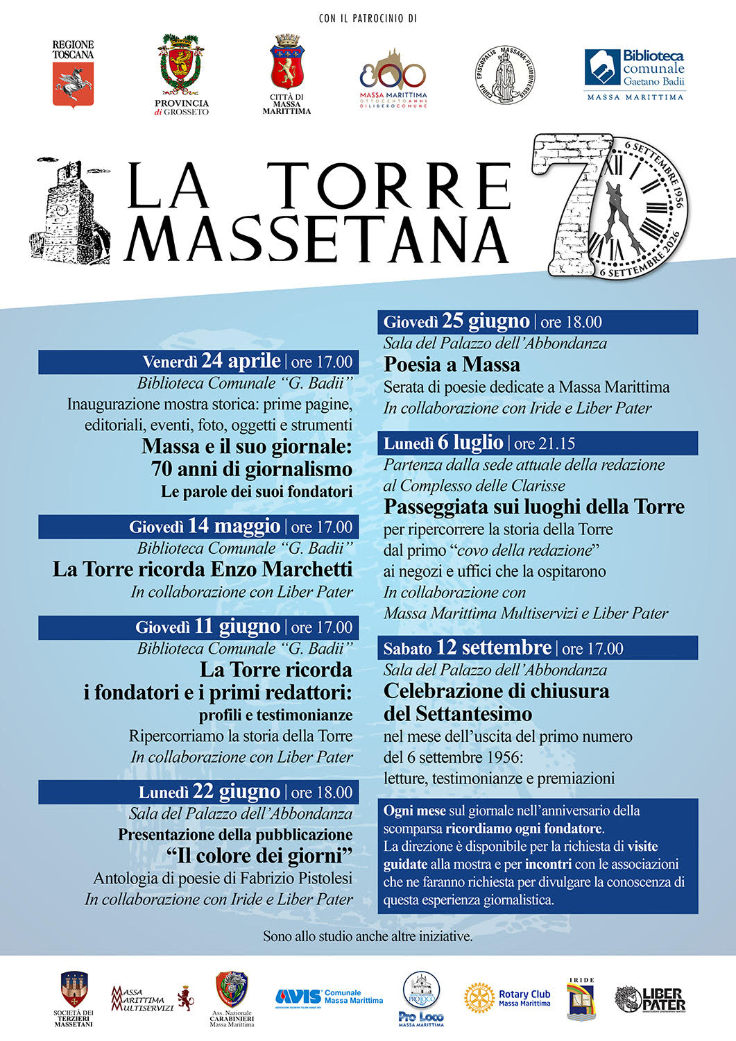La Torre Massetana quest’anno compie 70 anni di fondazione e ininterrotte pubblicazioni. Nel suo genere “La Torre” è il giornale più vecchio e più longevo della Regione Toscana certificato dalla registrazione presso il Tribunale di Grosseto che porta la data del 6 luglio 1956.